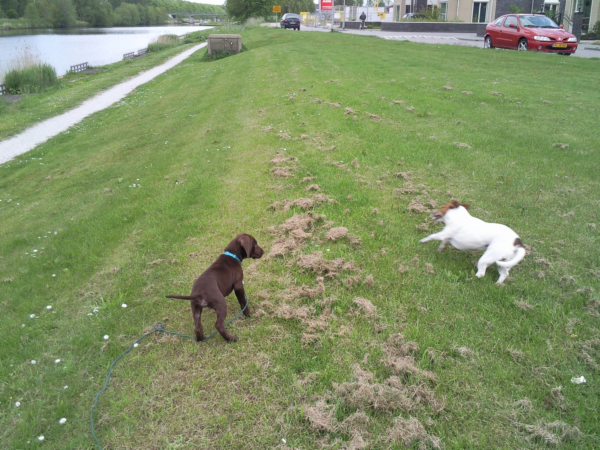 | Ik lig hier goed. | Graven dat kan ik ook!! | Wat is dit? | Waarom ren je rondjes? |